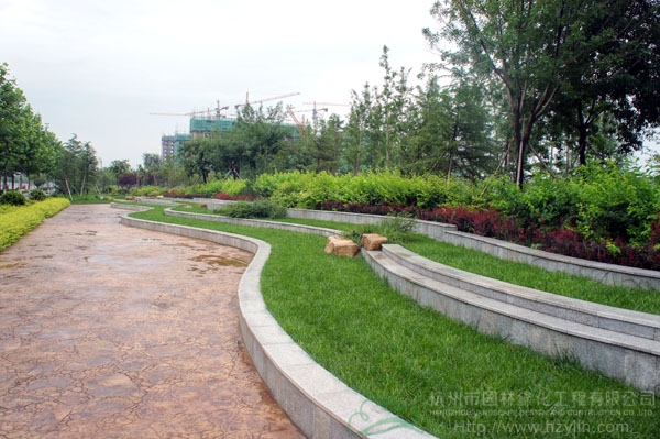 山東壽光市東環路東側綠化改造工程(圣城街-北環路)面積9萬平方米,施工范圍為機動車道與非機動車道之間2.5米的隔離綠化帶和30多米寬的路側綠化帶,施工內容包括土方地形整理、綠化種植、園路鋪裝、景石擺放、景觀小品營建等。2009年9月開工,2010年7月竣工。經過2年的精心養護,如今,這里樹木蔥郁,花草繁茂,一路走來,隨著多種風格的園路在腳下延伸,風景也在眼前不斷變化。