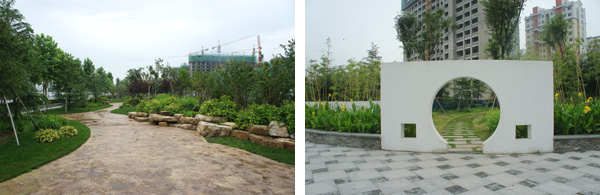 每個景觀節點上,植物的配置方法都是不一樣的,如在下沉廣場,主要是以小龍柏、金葉女貞等小灌木片植成方形或弧形,間或點綴石楠、梅樹,看起來規整、簡潔;而在設計風格為江南園林的南廣場上,是將貴重的造型油松單植,通過不同的組合,形成三個風格相近的綠島,周邊種植美人蕉、玉簪、竹子,并砌起白墻,上面開圓形拱門或圓窗,散發出詩意江南的靜謐和婉約氣息。"游憩步道是貫穿整個景觀的軸線,為了形成曲徑通幽的景觀效果,我們將對植、孤植、叢植都多種方法結合運用,特別是在三叉路口,多種植海棠、櫻花、杏花等,一方面,花開的時候,綠葉間繁花點點,會吸引人們不斷向前探尋更多的美景;而花落之后,茂密的枝葉又形成隱隱約約的視覺感受,前方轉過彎后風景什么樣,又讓人很想去看看。"高經理笑著說。