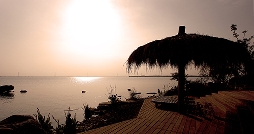 觀景平臺視野開闊,濱湖風光水天一色。臨湖的觀景平臺,原色的木質鋪裝,素樸的茅草亭,寬大的躺椅,營造出一個自在的小天地。這處觀景平臺,背后是珍珠泉泡池,泡完溫泉,可以直接來到觀景平臺,遠眺太湖的煙波浩渺,水天一色。