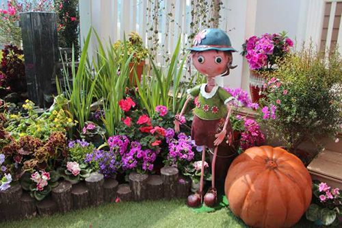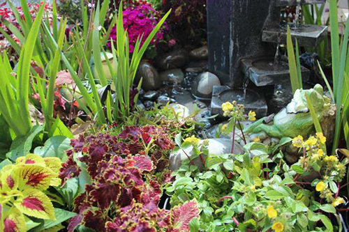 鵝卵石使溪水流淌更趨自然,美麗的鐵藝姑娘在花園中勞作。仔細(xì)看,旁邊還有青蛙王子樂(lè)隊(duì)的婉轉(zhuǎn)音樂(lè)。這些小細(xì)節(jié),增加了花境的趣味性。