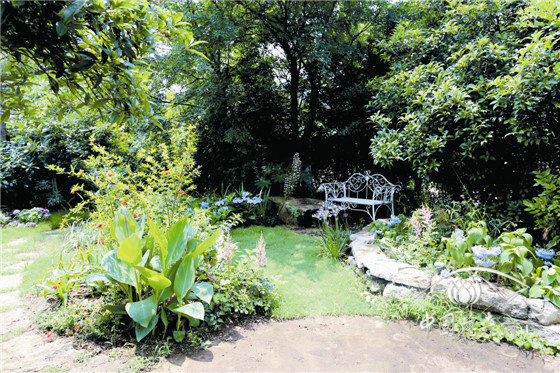 內(nèi)部八仙花花園,以櫸樹、景石、石籠擋墻及園路圍合成半開敞空間,以八仙花為主材,搭配鳶尾、石榴、落新婦、百子蓮等,組成3個花境組團,與白色座椅形成半私密的花園景觀。