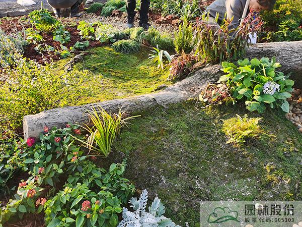 ①模擬苔蘚植物的生境條件,將蘚類濕地景觀與枯木結(jié)合,在枯木與卵石道路交叉部位布設(shè)小水塘,保持苔蘚生長環(huán)境土壤濕度。