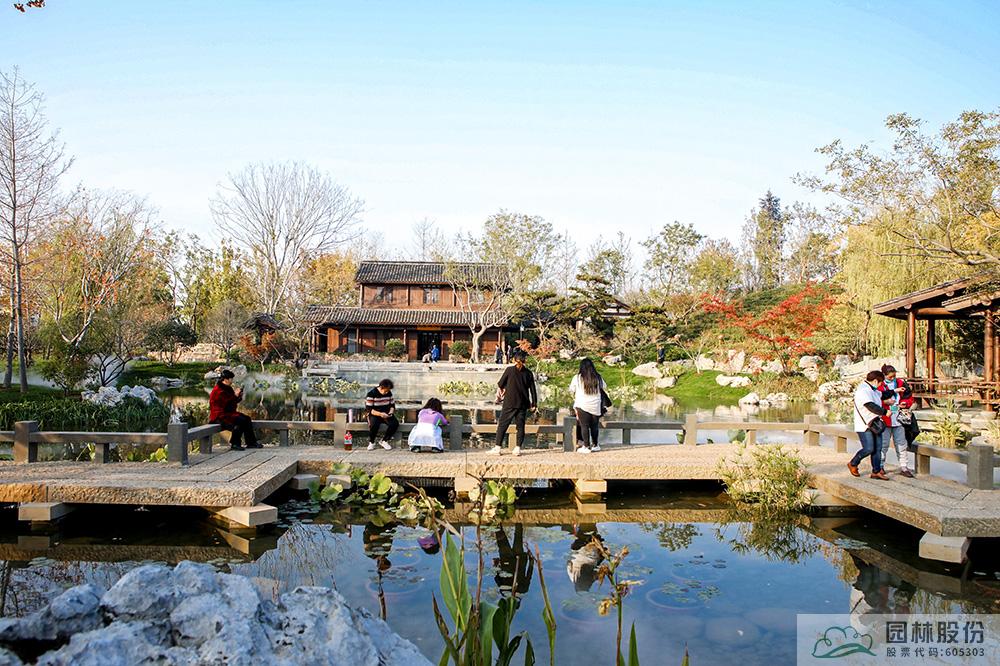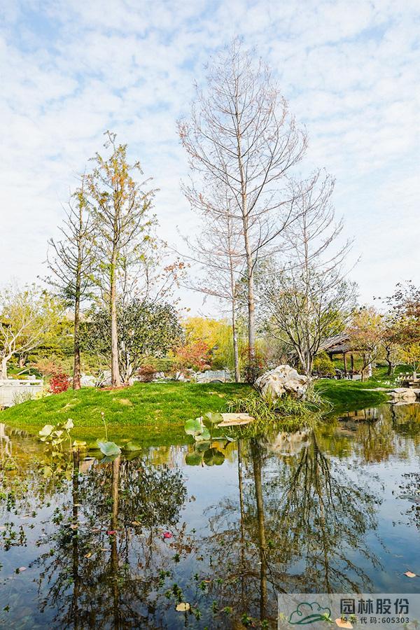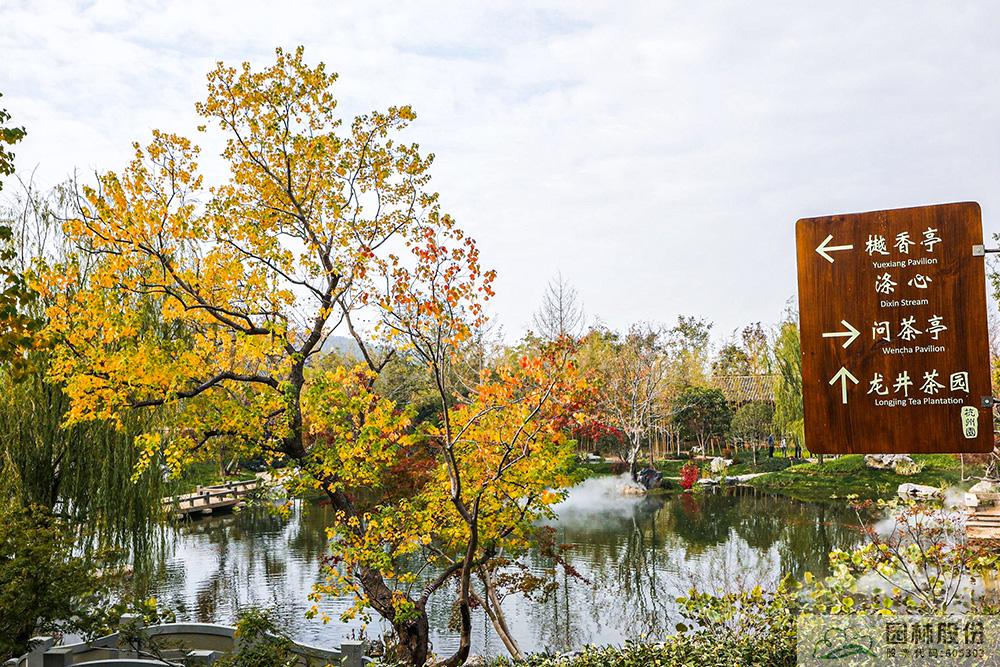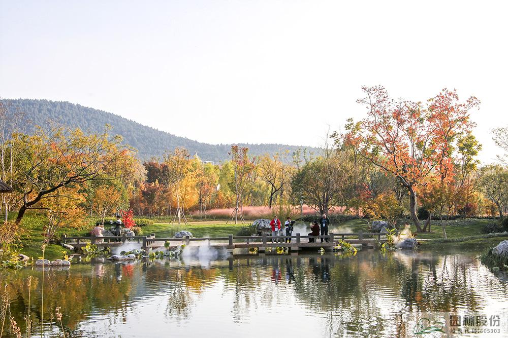 契合展區主題的樾香亭臨湖而立,雙坡屋面,八柱敞亭,柱子上書五言聯“魚樂人亦樂,泉清心共清”,盡顯悠閑舒適的情趣。在亭內憑欄而坐,側耳聽風雨,迎風嗅花香。抬頭遠望,荷葉亭亭的水面上,有魚兒在水中嬉戲;曲折的長橋上,游人在漫步觀景;水岸邊,銀杏、三角楓、烏桕等色彩繽紛,編織出一幅深秋的美麗畫卷。