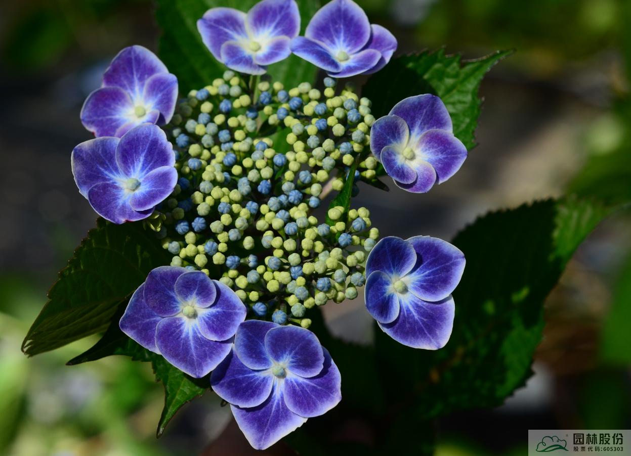 大葉繡球‘夢幻星空’:傘房狀聚傘花序盤狀,高度2~4cm,直徑10~12cm,上海及杭州5月中下旬開花,可延續(xù)至6月下旬;可孕花花瓣藍(lán)色;不孕花萼片先端白色至淺藍(lán)色中部藍(lán)色至紫色基部白色;花色夢幻,花型飄逸,適合家庭園藝和工程。